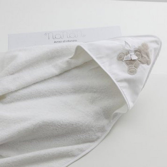 Comodo e indispensabile nel momento quotidiano del bagnetto, andegrave; utile per avvolgere completamente il bambino dopo il bagno, circondandolo con morbida spugna in cotone bianco al 100%.