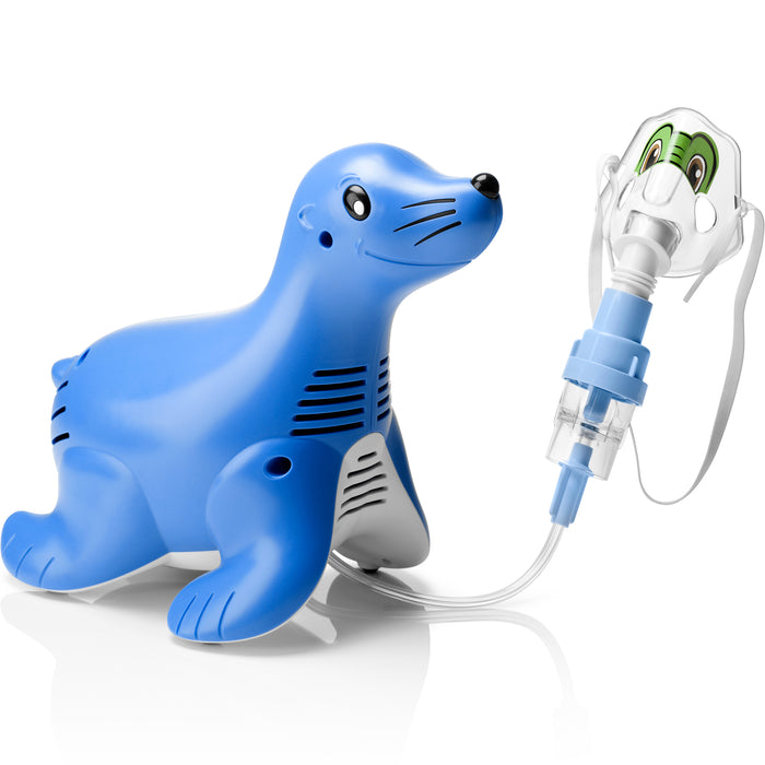 Il compressore pediatrico Philips Respironics Sami, a forma di foca, piace ai bambini, ai loro genitori e ai pediatri e aiuta i piccoli pazienti a praticare correttamente l'aerosolterapia. Funziona con i nebulizzatori ad alta efficienza SideStream.