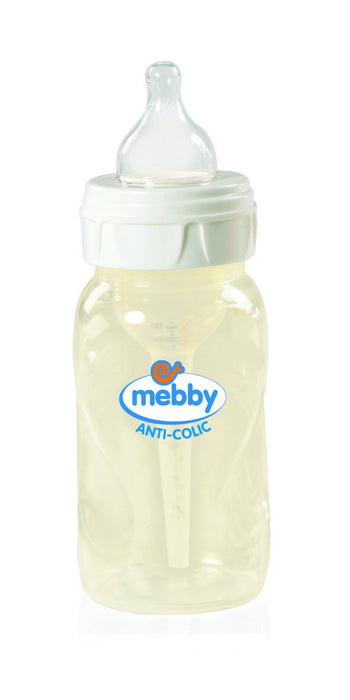 Mebby Biberon Step 1+2 Anti Colica In Silicone Il biberon Step 1+2 anti - colic è dotato di un doppio sistema valvolare brevettato che pone una soluzione adeguata ed innovativa ai problemi di coliche e otiti causati nel bambino dai biberon tradizionali. La valvola compensa naturalmente il vuoto d' aria che si crea all' interno del biberon durante la suzione, riducendo la pressione negativa nell' orecchio del bambino, possibile causa di otiti. L' aria inoltre attraversa la cannula e non entra a contatto con il latte, prevenendo la formazione di bollicine causa di coliche e gas intestinali.