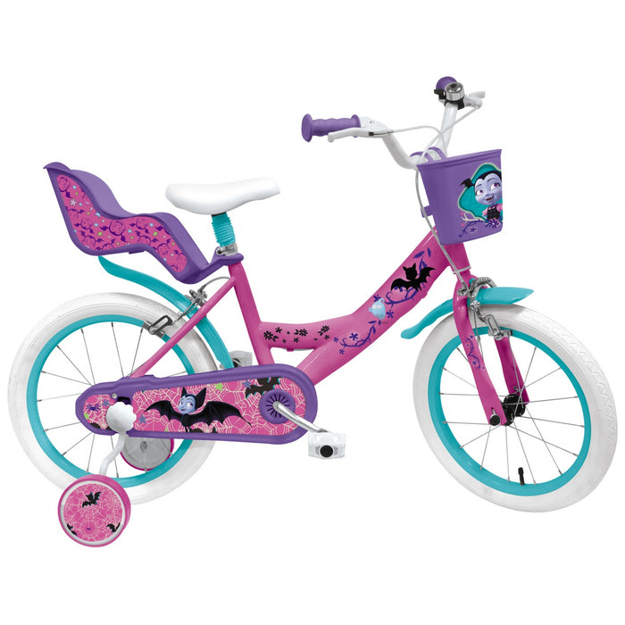 Bicicletta Mondo da 14 pollici, con fantastiche stampe di Vampirina. Telaio in acciaio, pneumatici Eva, ruote da 14 pollici. Dotata di parafango anteriore e posteriore. Altezza della sella regolabile. Con 2andnbsp;ruote di stabilizzazione posteriore per mantenere l'equilibrio nei primi periodi, cestello portaoggetti e sedile per le bambole. Freni anteriori e posteriori.