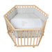 Box esagonale, legno naturale, H 73cm, diametro esterno 120cm, sbarre piatte, regolabile a 3 altezze, protezioni inclusi H: 23cm, 6 rotelle autofrenanti
