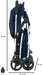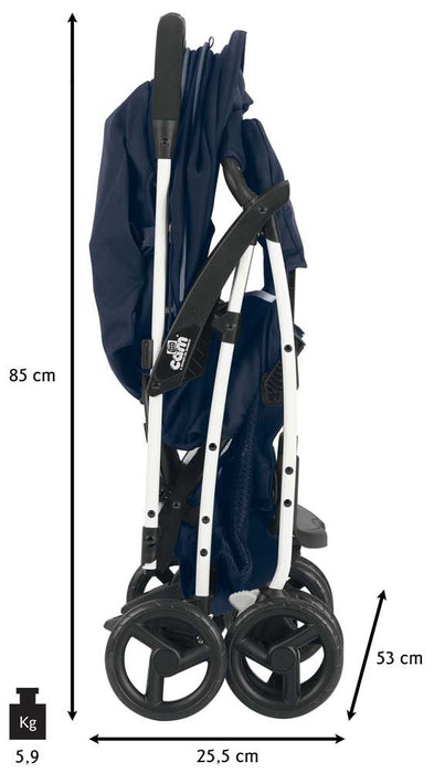 Dotato di ampia e profonda seduta, maniglione unito con sistema di chiusura ad una mano sola, poggiapiedi regolabile, davantino removibile, ruote anteriori piroettanti con sistema di blocco e freno, sospensioni su tutte le ruote, e cintura a 5 punti.  Accessori inclusi: capottina, coprigambe, parapioggia e cestino. Tessuto Sfoderabile e lavabile a 30°