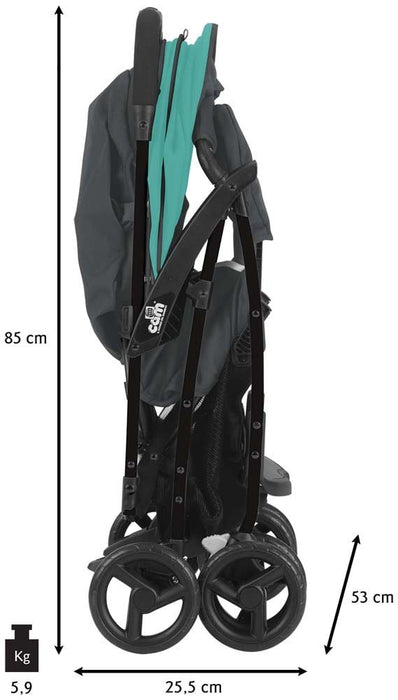 Dotato di ampia e profonda seduta, maniglione unito con sistema di chiusura ad una mano sola, poggiapiedi regolabile, davantino removibile, ruote anteriori piroettanti con sistema di blocco e freno, sospensioni su tutte le ruote, e cintura a 5 punti.  Accessori inclusi: capottina, coprigambe, parapioggia e cestino. Tessuto Sfoderabile e lavabile a 30°