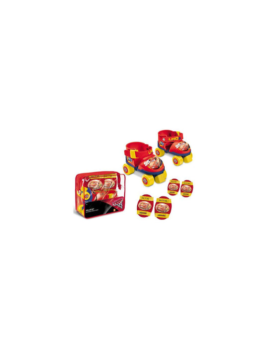 Una confezione con all'interno un paio di pattini di Cars 3 regolabili dalla taglia 22 a 29 e protezioni per le ginocchia e gomiti con immagine stampata di Cars 3.