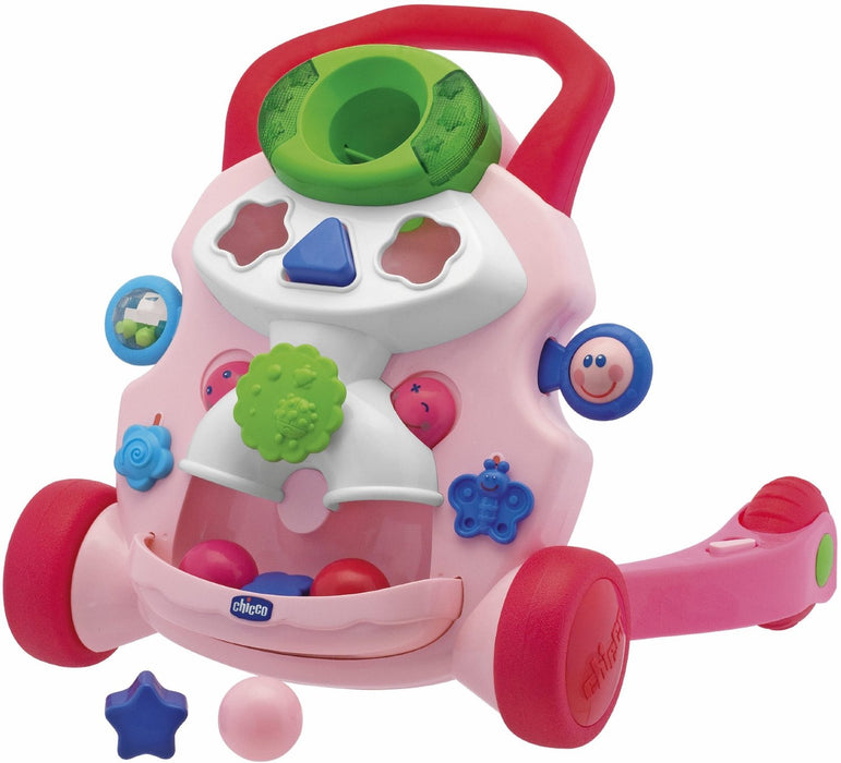 Aiuta il bambino a muovere i primi passi in sicurezza accompagnato dalla musica. Basta appoggiarsi alla maniglia, iniziare a camminare e il gioco comincia a suonare una melodia che si interrompe appena il bambino si ferma. Diventa un centro attività con il gioco degli incastri, luci ed effetti sonori. 2 in 1: primi passi e centro attività.