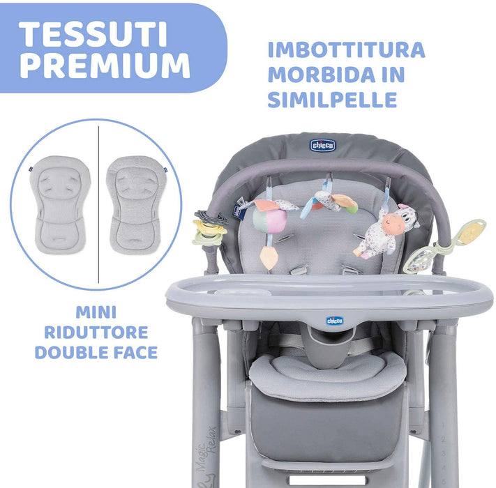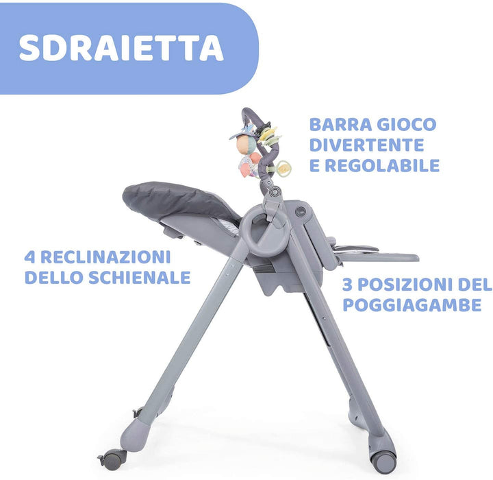 SEGGIOLONE RECLINABILE: Polly Magic Relax è il seggiolone Chicco ottimale dalla nascita ai 3 anni, con schienale reclinabile in 4 posizioni, comodo poggiagambe, barra gioco e cuscino riduttore
