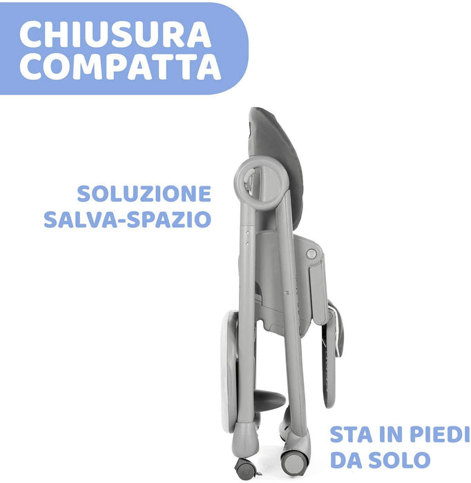 4 RUOTE: Il seggiolone può essere spostato senza problemi per affiancarlo al tavolo o cambiarne la posizione sia da aperto che da chiuso, grazie alle 4 comode ruote, 2 delle quali piroettanti e bloccabili