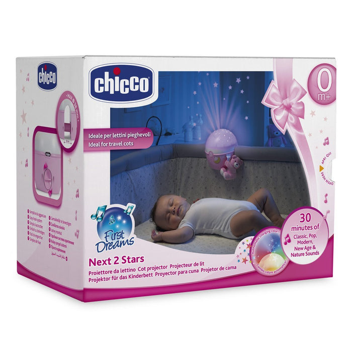 Innovativo pannello proiettore con uno speciale sistema di aggancio, pratico e sicuro, per lettini da campeggio. Proiezione con cambio automatico del colore. 3 diversi effetti luminosi: proiezione notturna, proiezione soft e luce anti buio. Sensore sonoro: attiva luci e musica se il bambino piange, per rassicurarlo e aiutarlo a riaddormentarsi. Regolatore di volume. 30 minuti di musica e proiezioni. Pupazzo soffice rimovibile e lavabile in lavatrice. Disponibile in rosa e azzurro. Aggancio adatto a lettini con tubolare fino a 38mm. Può essere anche appoggiato sul comodino o sulla cassettiera.