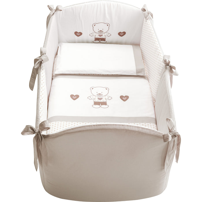 Completo Piumone Pali Sfilabile Zoe Crema Completo piumone 3 Pezzi Sfilabile è comprensivo: piumotto sfilabile, paracolpi e federa cuscino. Composizione: Tessuto in cotone 100% con applicazioni ricamate.
