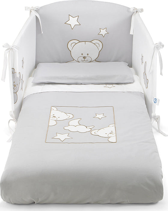 Completo Piumone sfilabile in 3 pezzi: Piumone sfilabile, paracolpi e federina, Tessuto cotone 100%, Applicazioni ricamate. Il piumone è sfilabile così da poter utilizzare il rivestimento come copertina estiva!!!