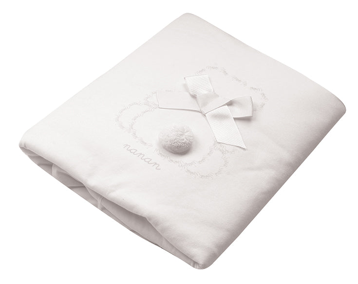 La copertina da letto Nanàn della linea Orsetto è una morbida coperta in Jersey, con un ricamo centrale con l'orsetto.