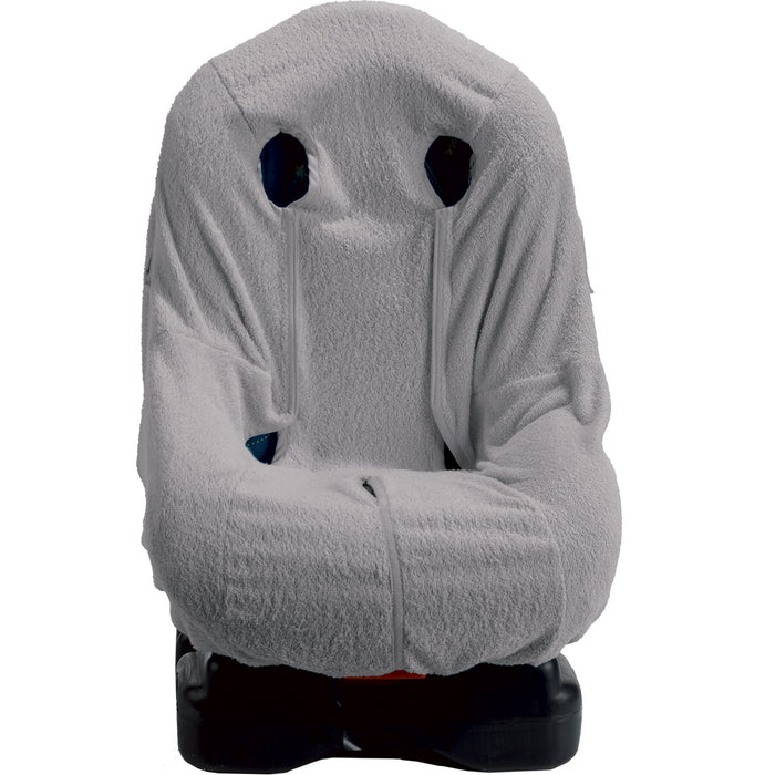 Rivestimento in morbida spugna ricca di cotone per seggiolini auto con passaggio di cinture regolabile mediante pratici stretch. Si adatta e a varie tipologie di seggiolini grazie al bordo elastico continuo ed alle asole laterali che consentono il passaggio delle cinture di sicurezza.