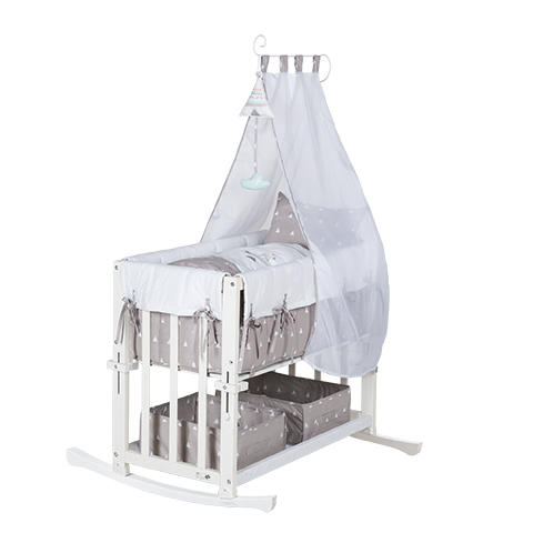 La nuova culla completa 4 in 1 di Roba è perfetta per i genitori che non vogliono perdere tempo: utilizzabile come lettino da affiancare al letto parentale, culla, lettino e panca con incluso materasso, la biancheria per la culla, l'imbottitura, il baldacchino con il supporto, pattini e 4 rotelle, paracolpi, ripiano e scatole portaoggetti in tessuto.