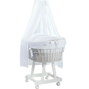 Una Culla Ovale composta da Struttura + Rivestimento completo di materasso + Velo + Piumetto.
