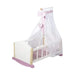 - E?dotata di un cuscino, di una copertina e di un baldacchino con cuoricino pendente con fiocco. Il tessile ha un motivo stampato con una corona.