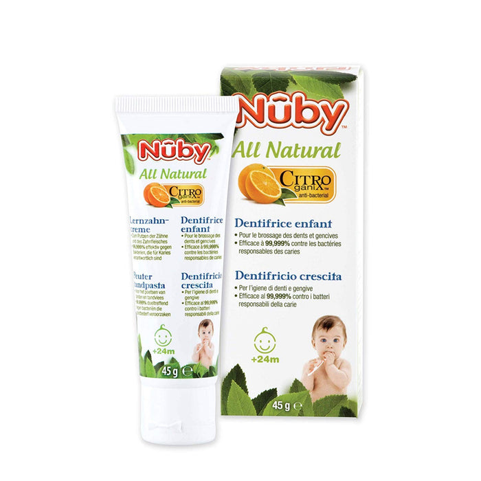Il dentifricio NûbyTM CitroganixTM e' completamente naturale. Questo dentifricio senza fluoruro e' stato studiato specificatamente per i bambini a partire dai 24 mesi. Sicuro se ingerito, il ns. dentifricio crescita lenisce le gengive ed e' efficace al 99,999% contro i batteri responsabili della carie (CitroganixTM). Per un utilizzo quotidiano dai 24 mesi in su' Efficace al 99,999% contro i batteri responsabili delle carie Efficace per 4 ore dall'apllicazione Lenisce le gengive irritate (CitroganixTM) Sicuro se ingerito Senza fluoruro, parabeni, fenossietanolo e alcool Ingredienti completamente naturali Aroma Tuttifrutti Cio' che rende il ns. dentifricio crescita unico nel suo genere e' la combinazione di un antibatterico naturale con altri ingredienti naturali selezionati accuratamente per le loro propieta' lenitive e pulenti, tutto in un gel che e' sicuro se ingerito. ________________________________________________________________________ Consigli d'uso Per l'igiene orale quotidiana dei denti: applicare una piccola quantita' di dentifricio sullo spazzolino. Spazzolare delicatamente denti e gengive in senso verticale. Sciacquare la bocca Si puo' utilizzare il gel dentizione NûbyTM CitroganixTM (+4 mesi) per alleviare eventuali dolori durante la dentizione