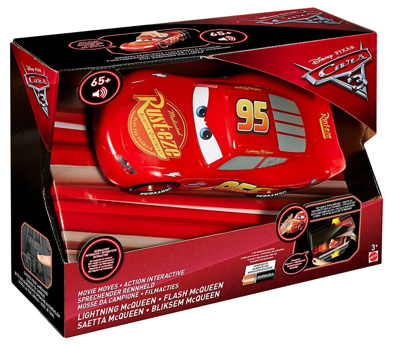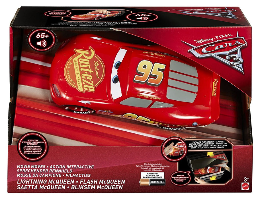 Dal film “Cars 3” Saetta McQueen Re-Action Interattivo. Il veicolo reagisce con luci e frasi (tipiche dei personaggi) in base a come il bambino li muove e li fa interagire con l’ambiente: risponde ai movimenti nelle diverse direzioni e agli eventuali scontri e rotazioni. Pronuncia più di 20 frasi ed è dotato di fari anteriori e posteriori funzionanti e occhi che si muovono.