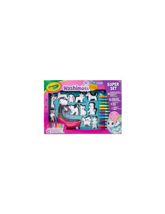 Washimals - Pets Super Set per decorare e personalizzare i cuccioli vellutati con gli appositi pennarelli lavabili crayola. Dodici adorabili cuccioli tra gattini,cagnolini, coniglietti e anche un criceto. I bambini potranno poi lavare i washimals nella vasca e fargli il bagnetto per rimuovere il colore e colorare di nuovo