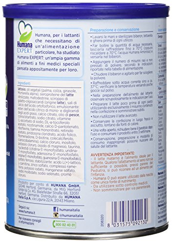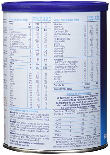 Humana 0 è un alimento dietetico a fini medici speciali, indicato per il trattamento alimentare dei lattanti prematuri e/o di basso peso alla nascita, superiore a 1500 g, come complemento del latte materno o come unica fonte nutrizionale; ha una formulazione studiata per fornire tutti i nutrienti indispensabili per il rapido ed armonico recupero ponderale del prematuro, in ospedale e a casa Humana 0 contiene sieroproteine idrolizzate, lc-pufa (acidi grassi polinsaturi a lunga catena), gos e nucleotidi ed è caratterizzato da un elevato apporto energetico e proteico. humana 0 deve essere utilizzato sotto controllo del medico pediatra Per il benessere del lattante seguire attentamente le istruzioni riportate sulla confezione. la quantità di humana 0 deve essere determinata esclusivamente dal medico pediatra. conservazione la confezione integra di humana 0 va conservata a temperatura ambiente, in luogo fresco, asciutto e lontano da fonti di calore; una volta aperta la confezione, richiudere e consumare entro 3 settimane