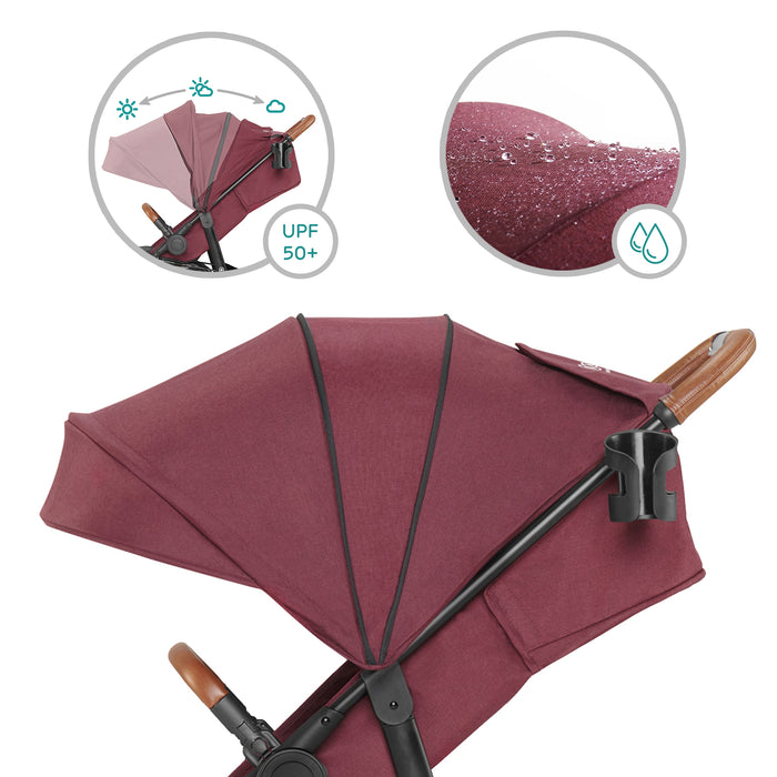Materiale impermeabile con UPF50+ - non devi preoccuparti del caldo estivo o delle piovose serate autunnali. La capottina del passeggino è stata appositamente preparata!