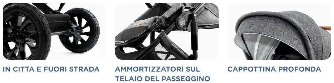 Un’ampia navicella per i primi mesi e poi un maneggevole passeggino, ampio, resistente, ma leggero e facile da guidare, anche sui terreni più irregolari.