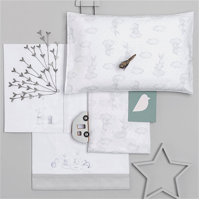Lenzuoline per Lettino Chicco Nuvolette di Latte Il Set Lenzuoline e' composto da 3pz: Lenzuolo, Lenzuolo sotto con angoli, Federa cuscino