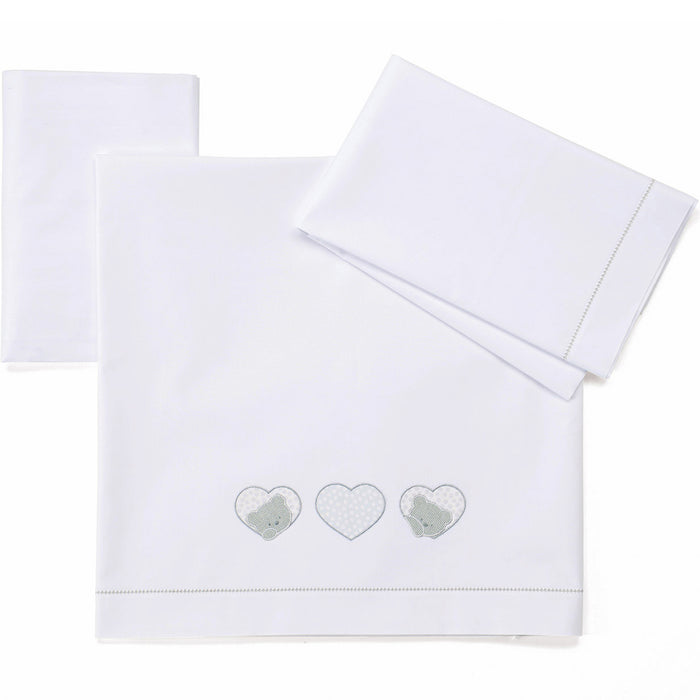 Set lenzuolo per lettino Lovely composto da: lenzuolino sopra ricamato, lenzuolino sotto con angoli, federa per cuscino. Il tutto in cotone 100%. Il completo lenzuolino Lovely di Foppapedretti è caratterizzato da eleganti ricami che richiamanole fantasie della cameretta.