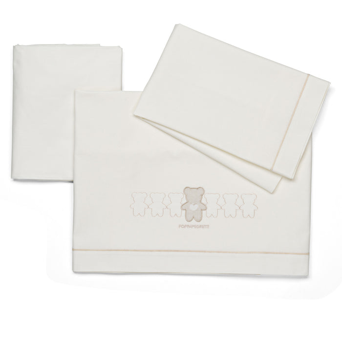 Lenzuoline per Lettino Foppapedretti Teddy Love 3 Pz Set lenzuolo per lettino Teddy Love composto da: lenzuolino sopra ricamato, lenzuolino sotto con angoli, federa per cuscino. Il tutto in cotone 100%. Il completo lenzuolino Teddy Love di Foppapedretti è caratterizzato da eleganti ricami che richiamano le decorazioni di teneri orsetti e cuori della cameretta. Il set è composto da lenzuolino sopra ricamato, lenzuolino sotto con angoli e federa per cuscino. Dimensione Lenzuoline per Lettino Foppapedretti Dimensione Lenzuolino: 180 x 120 cm Dimensione Coprimaterasso: 120 x 65 cm Dimensione Federa: 60 x 40 cm