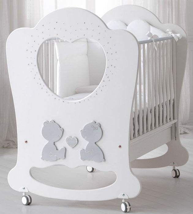 Il Lettino Cuore di Mamma si contraddistingue per il suo design tondeggiante e per l'apertura a forma di cuore situata sulla pediera. I preziosi cristalli Swarovski® e gli eleganti effetti dell'argento conferiscono brillantezza a tutto il mobile e luminosità alla stanza del bimbo. Tenera protagonista è una coppia di orsacchiotti circondata da dolci cuoricini luccicanti.