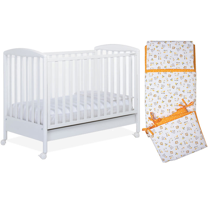 Lettino con sponda regolabile e ampio cassetto. Dotato di 4 ruote proiettanti di cui 2 con freno. Rete a doghe. Il Lettino ha una sponda regolabile ma, la stessa, non si puandograve; rimuovere. Materassino non incluso nell'offerta.