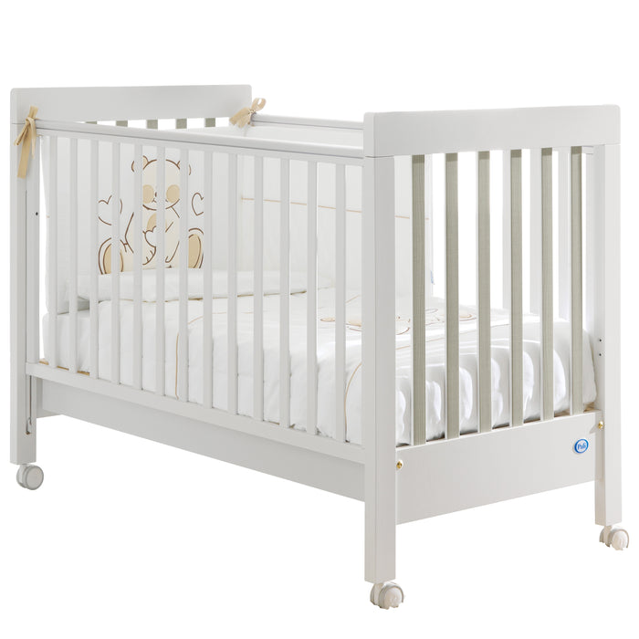 Lettino Pali Zoom Rovere Grigio Lettino Pali Zoom con cassetto, in legno di faggio. Ogni lettino e ogni componente delle camerette Pali è sempre progettato all'insegna della praticità per rendere il più semplice possibile le operazioni di montaggio. La distanza e la forma delle stecche delle sponde sono fondamentali per la sicurezza del bimbo, che a pochi mesi incomincia a muoversi nel lettino. Caratteristiche Lettino Pali Zoom Ruote piroettanti, dotate di freno di bloccaggio, rivestite in gomma "antigraffio" Vernici e materiali atossici. Lettino in legno di faggio Rete ortopedica interamente realizzata a doghe di legno con due posizioni: per il neonato si sistema in alto, facilitando così il lavoro alla mamma, si sistema più in basso quando il bambino sa già arrampicarsi e ha bisogno di sponde alte per non cadere. Guaina protettiva atossica sulle sponde. Ampio cassetto Kit doppia altezza Materasso consigliato: cm. 64x124 Posizione prima nanna: sì Sponda mobile: sì Compatibile con kit dondolo: no Sponde dotate di guaina para morsi: sì Dimensione e Peso Lettino Pali Zoom Dimensioni: 131 x 77 x 100(h) cm Peso: 30 kg