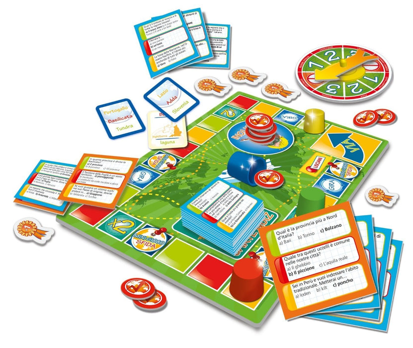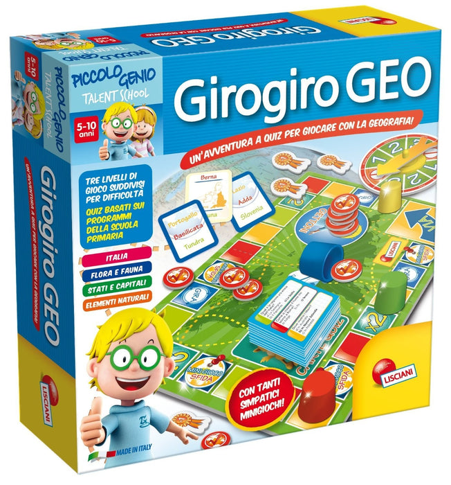Questo bellissimo gioco di società della linea piccolo genio, si chiama girogiro geo, è consiste nel raggiungere il traguardo rispondendo in modo corretto ai quiz sugli stati, le capitali, flora, fauna.