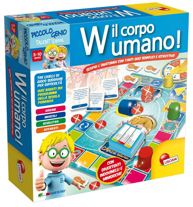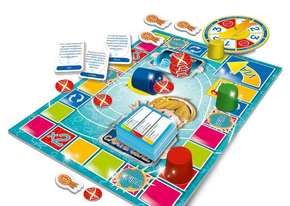 Questo fantastico gioco di società W il corpo umano, consiste nel raggiungere il traguardo rispondendo ai quiz sugli organi, muscoli, apparati, scheletro.