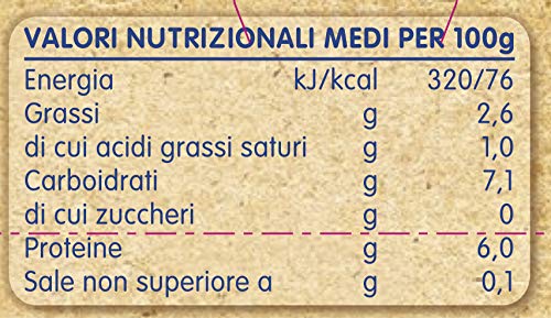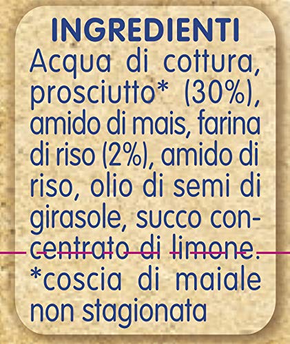 Confezione da 24 vasetti da 80g l?uno di vetro e chiusi sottovuoto con capsula metallica Ingredienti: Acqua di cottura, prosciutto* (30%), amido di mais, farina di riso (2%), amido di riso, olio di semi di girasole, succo concentrato di limone. *coscia di maiale non stagionata Alimento per l?infanzia. Omogeneizzato con carne di Manzo e farina di riso senza sale aggiunto. Non contiene glutine Per pappa e minestrine: togliere il tappo, scaldare a bagnomaria o nel microonde e aggiungere alla pappa All?inizio dello svezzamento consumare una quantità di prodotto secondo le indicazioni del Pediatra, incrementando gradualmente la dose col proseguire dello svezzamento