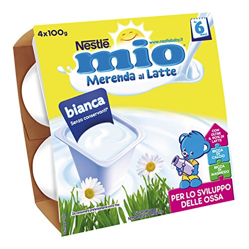 Merenda preparata con oltre l'80% di latte Ricca di calcio e magnesio per lo sviluppo delle ossa; ricca di zinco, necessario per la crescita Senza glutine, senza conservanti e coloranti (come per legge) Non ha bisogno di frigo: grazie alla tecnologia utilizzata, si conserva a temperatura ambiente Contiene 4 pratici vasetti di plastica da 100g, per poter essere consumati anche fuori casa