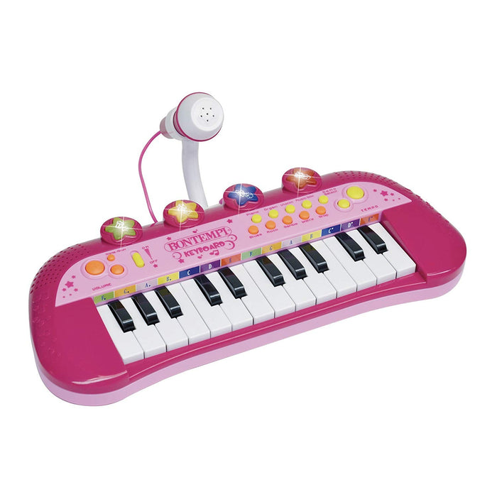 Tastiera elettronica Bontempi a 24 tasti con fantastico microfono andbull; 4 pads andbull; 4 suoni andbull; 4 ritmi andbull; 6 brani preregistrati andbull; Regolazione volume e tempo andbull; Microfono andbull; Alim: 3 batterie da 1,5 V R6/AA (non fornite)