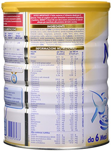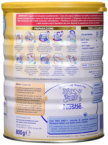 Latte di proseguimento in polvere indicato per l'alimentazione del lattante a partire da 6 mesi di vita Con optipro h.a., miscela di proteine escluve parzialmente idrolizzate Con fermenti lattici vivi Con lc-pufa: ?6 (acido arachidonico - ara) e ?3 (acido docosaesaenoico - dha), coinvolto nello sviluppo della vista Latta da 800g contenente un pratico misurino per il dosaggio secondo tabella riportata sul retro della confezione