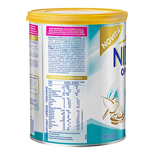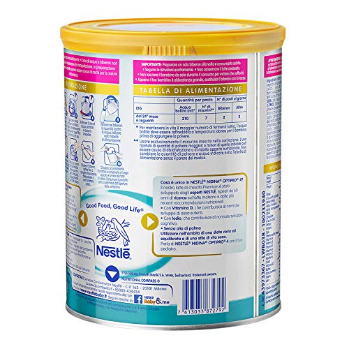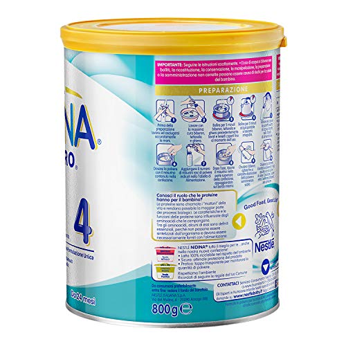 Latte per la crescita in polvere, studiato appositamente per bambini a partire da 24 mesi Con fermenti L. Reuteri, apporto bilanciato di proteine Nidina 4 va inserito all'interno di una dieta varia ed equilibrata e di uno stile di vita sano Vitamina A e Zinco, senza olio di palma Latta da 800 g contenente un pratico misurino per il dosaggio secondo tabella riportata sul retro