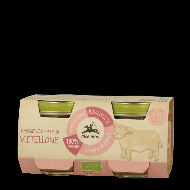 L’omogeneizzato di vitellone Alce Nero è prodotto con ingredienti italiani: il vitellone proviene da allevamenti selezionati in Italia, dove i bovini vengono allevati in spazi che ne garantiscono la libertà di movimento. La ricetta è pulita dal superfluo e studiata per lasciare inalterato il gusto della carne, consentendo di nutrire i bambini senza l’utilizzo di aromi, coloranti, conservanti ed olio. Tutti gli omogeneizzati base carne vengono lavorati nel nostro stabilimento certificato per la produzione di alimenti per l’infanzia. La carne di vitellone viene tritata finemente (omogeneizzata) per renderla facilmente deglutibile e digeribile; una volta confezionati, i vasetti vengono sottoposti ad un trattamento termico che ne garantisce la stabilità nel tempo. Questo omogeneizzato è privo di glutine.