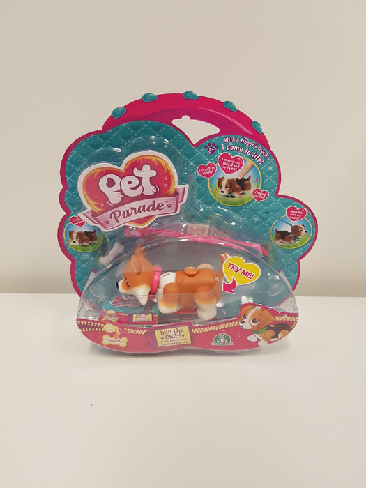 Colleziona i teneri cagnolini della linea pet Parade, tocca sulla schiena e lui inizierà a muovere le zampe, la coda, la testa e gli occhi. Questo tenerissimo cagnolino ha un pelo bianco e marrone e con un bellissimo collare rosa, inoltre nella confezione puoi trovare un osso, il guinzaglio e un adesivo per dagli il nome che desideri.