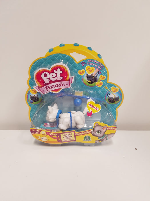 Colleziona i teneri gattini della linea pet Parade, tocca sulla schiena e lui inizierà a muovere le zampe, la coda, la testa e gli occhi. Questo tenerissimo gatto ha un pelo bianco con un bellissimo collare blu, inoltre nella confezione puoi trovare un gomitolo di lana, il guinzaglio e un adesivo per dagli il nome che desideri.