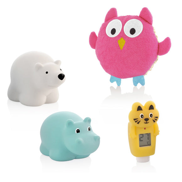 Set Bagnetto Miniland Bath Kit il Set Bagnetto Bath Kit è composto da: Divertente termometro a forma di tigre che misura la temperatura dell'acqua della doccia Una gradevole spugna di morbido filo di cotone e fibra naturale a forma di gufo Due animaletti in gomma (orso e ippopotamo) per giocare nell'acqua Bath kit è un simpatico set da bagno e doccia per il bebè composto da un termometro a forma di tigre che misura la temperatura dell'acqua che esce dalla doccia, una spugna in fibre naturali e cotone a forma di gufo e due animaletti in gomma (ippopotamo e orso) per divertirsi nell'acqua. Un Simpatico set per il bagno e la doccia Divertente kit composto da un termometro da doccia a forma di tigre, una gra- ziosa spugna da bagno e due animaletti in gomma che diventeranno i migliori amici del bebe` durante il bagnetto. Un tigre, un gufo, un ippopotamo e un orso saranno i compagni perfetti al momento del bagnetto. Protegge il bebè I bebe` sono molto sensibili alle temperature troppo alte o troppo basse. Con il termometro per doccia si potra` controllare la temperatura a cui esce l'acqua in ogni momento, con allarme visivo quando vengono superati i 39oC. Molto pratico per risciacquare il bebe` direttamente con la doccetta alla perfetta temperatura. Termometro molto facile da installare Basta avvitare il termometro tra il manico della doccia e il tubo. Inoltre e` ricoperto da una tigre di gomma a mo' di protezione. Spugna in filo di cotone e fibre al 100% naturale per un bagno dolce rilassante L'attraente spugna forma di gufo e` fatta con materiali di prima qualita`. La parte frontale e` in velluto riccio di cotone, che dara` al bebe` tutta la dolcezza di cui ha bisogno per un buon bagno. Mentre la parte posteriore della spugna e` in sisal, una fibra al 100% naturale e biodegradabile. Suoni divertenti e molti giochi L'orso e l'ippopotamo diventano i compagni ideali di gioco