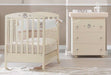 Lettino con struttura in legno massello di faggio e elementi in MDF. Grande cassetto, 4 ruote girevoli in gomma antitraccia di cui due frenanti. Entrambe le sponde sono mobili con il sistema di movimento secur-baby azionabile in due movimenti. Kit. Conforme alla norma europea EN 716-1: 2008 +A1: 2013