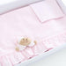 Il set lenzuola carrozzina Nanàn è formato da: federa per cuscino, lenzuolino e coprimaterasso. Il lenzuolino è impreziosito dall'applicazione del piccolo orsetto Puccio e da una romantica balza.