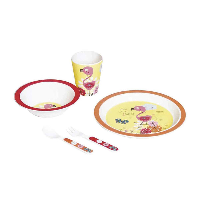 Il set è composto da 5 pezzi: ciotola, piatto piano, bicchiere, cucchiaio e forchetta.