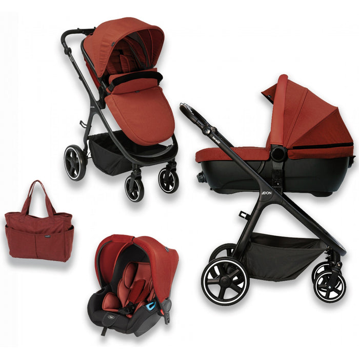 Il Trio Adon permette di muoversi comodamente sia in cittandagrave; che in campagna grazie alle grandi ruote posteriori. andEgrave; un passeggino leggero e compatto, omologato 22kg. Ha un telaio in alluminio che pesa solo 6,9 kg e una larghezza contenuta a 57 cm. Estremamente versatile, puandograve; essere combinato con navicella omologata* (con kit omologato auto Adon cod.535) gruppo 0 e seggiolino auto Adon gruppo 0+. Ogni componente andegrave; acquistabile separatamente per rispondere alle singole esigenze. Completa la dotazione: borsa fasciatoio Adon con materassino, coprigambe per passeggino (copertina della navicella), e mantellina parapioggia.
