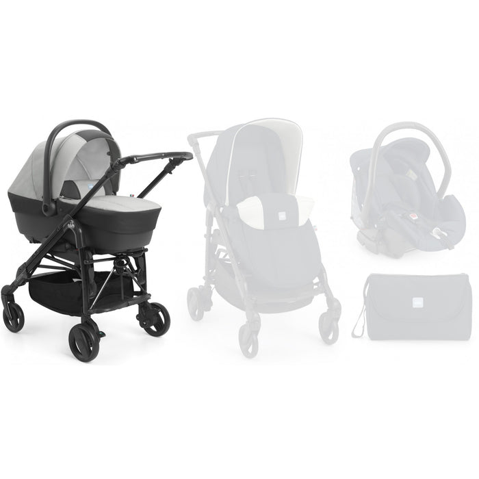 Omologata per il trasporto in auto (0-10 kg), molto ampia, dotata di aggancio/sgancio rapido Quicky System, con maniglione antiribaltamento, schienale reclinabile in 3 posizioni, materassino, modellistica dallo stile moderno, fondo aerato, borsa. La capottina e la copertina della carrozzina possono essere utilizzate per completare il passeggino;