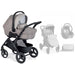 N.B.: Le immagini sbiadite in foto (passeggino, seggiolino auto, borsa) sono solo da esempio per la composizione del Trio. Per colori tessuti e ricami, di questi componenti, si fa riferimento all'immagine della carrozzina.