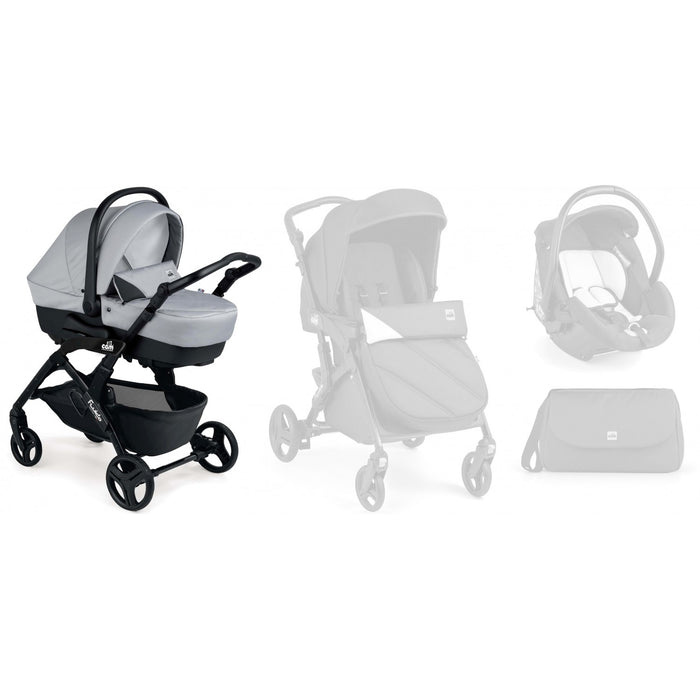 CARROZZINA: Omologata per il trasporto in auto (0-10 kg), molto ampia, dotata di aggancio/sgancio rapido Quicky System, con maniglione antiribaltamento, schienale reclinabile in 3 posizioni, materassino, modellistica urbana con capottina e copertina reversibili, capottina e copertina con zanzariera, fondo aerato, base a dondolo, borsa con fasciatoio.