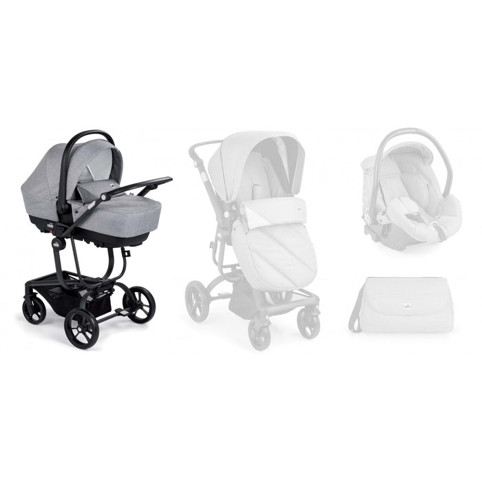 PASSEGGINO: telaio in alluminio con morbido maniglione ergonomico e regolabile in altezza, con seduta reversibile (fronte mamma 6-12 mesi e fronte strada 12-36 mesi), ruote posteriori ad ampio raggio, ruote anteriori piroettanti, tutte facilmente removibili, freno a pedale, morbide sospensioni anteriori e posteriori, schienale regolabile in 4 posizioni con una sola mano, davantino removibile, cinghia a 5 punti, spallacci imbottiti, capottina estensibile, cestino. Chiusura a libro compatta, anche con la seduta in posizione di marcia.